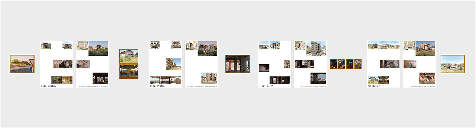 The work originates within a research project promoted by the dAeD Department of the Mediterranean University of Reggio Calabria, which launched an international open call for architects on the theme of reuse. The authors selected several buildings along the SS106 motorway, documenting them with rigour through frontal, lateral, internal and aerial views organised in a grid. Often unfinished or abandoned, these structures emerge as “works in transition”: suspended between a criminal past and the possibility of rebirth.